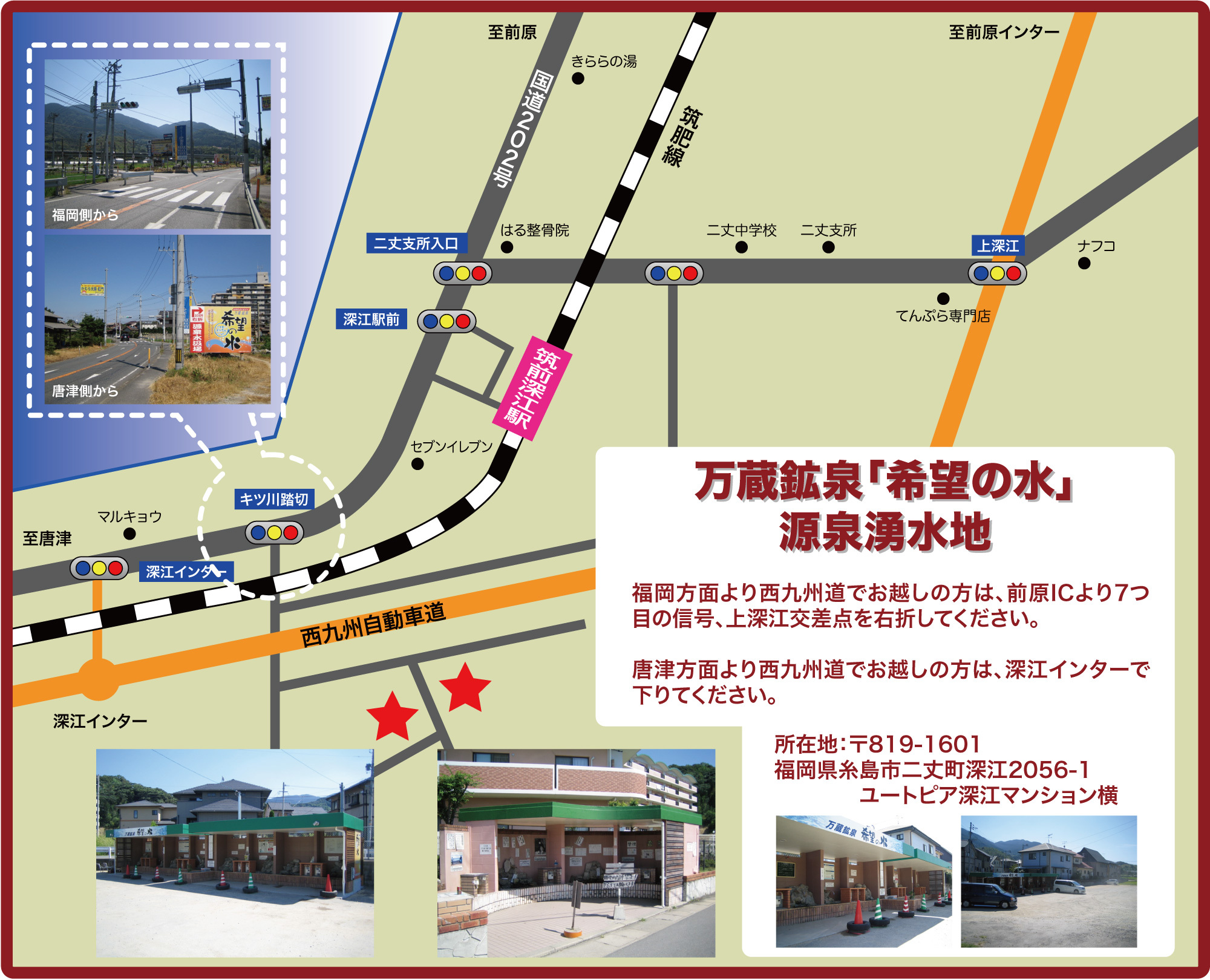 福岡方面より西九州道でお越しの方は、前原ICより7つ目の信号「上深江」交差点を右折して下さい。