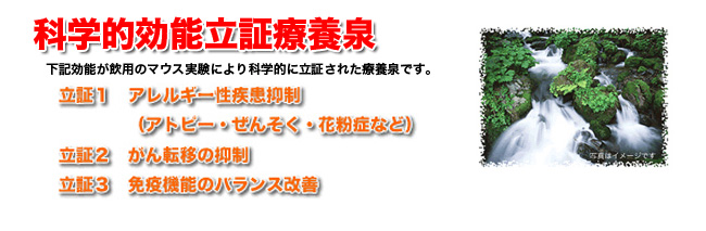 (1.免疫機能バランス改善、2.アレルギー性疾患抑制〈アトピー、ぜんそく、花粉症など〉、3.がん転移抑制)は、「万蔵鉱泉 希望の水」だけで、この名称以外に販売している水とは一切関係ありません。